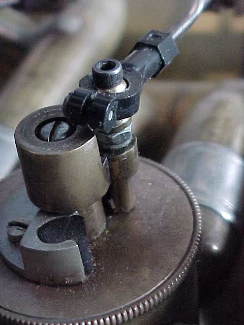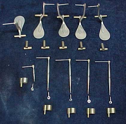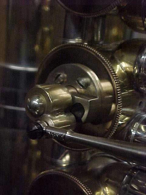 The stop arms were originally altered using a hacksaw and a file. Employing "allen head" bolts, washers and lock-nuts for the plastic connectors and steel threded rod a functional linkage was cheaply constructed. It works but on such a fine hand made instrument it looks rather shabby. The image to the right shows the same part after converting to a mini-ball link with nickel-silver connecting rod.