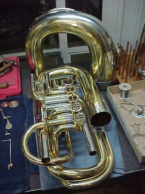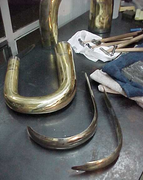 The inside branches were cleaned and lightly polished. Dents were softened if not removed completely. Some replacement braces were made to match the originals as was a pull ring for the fifth valve tuning slide and ring for the strap flange on the backside of the bell that had been broken off and lost long ago.