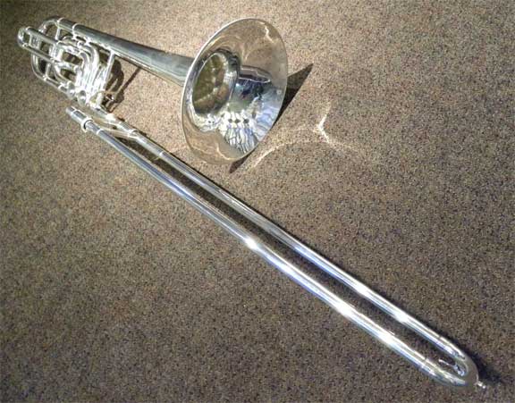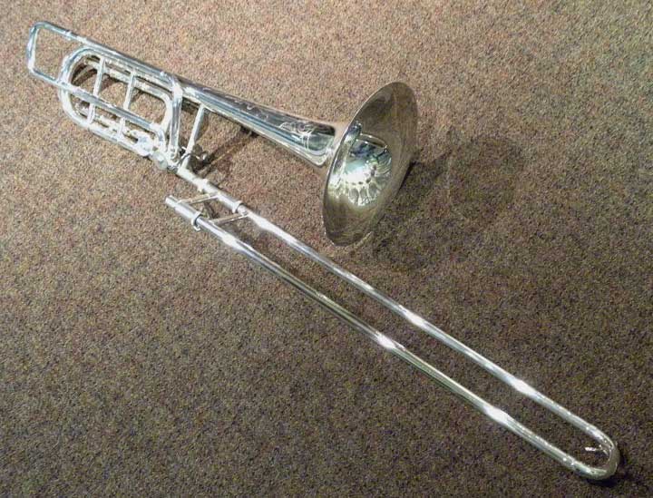 Serial No. 125XXX, Professional bass trombone, Silver plated finish with additional hand engraving (nice). Almost new condition, Independant open-wrap configuration. Big broad sound. If you are serious about your playing, this will do the job with style. Original case included (minor scuffs but still in real good shape). Horn will be fully serviced prior to sale. Call for details. 206.241.5767